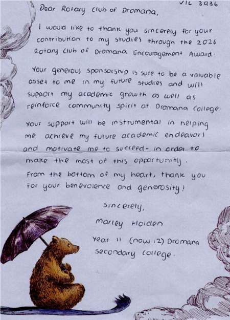 Finally, Wayne read out a thankyou note from one of the recipients of our bursaries at Dromana Secondary College. (See below. Ed)